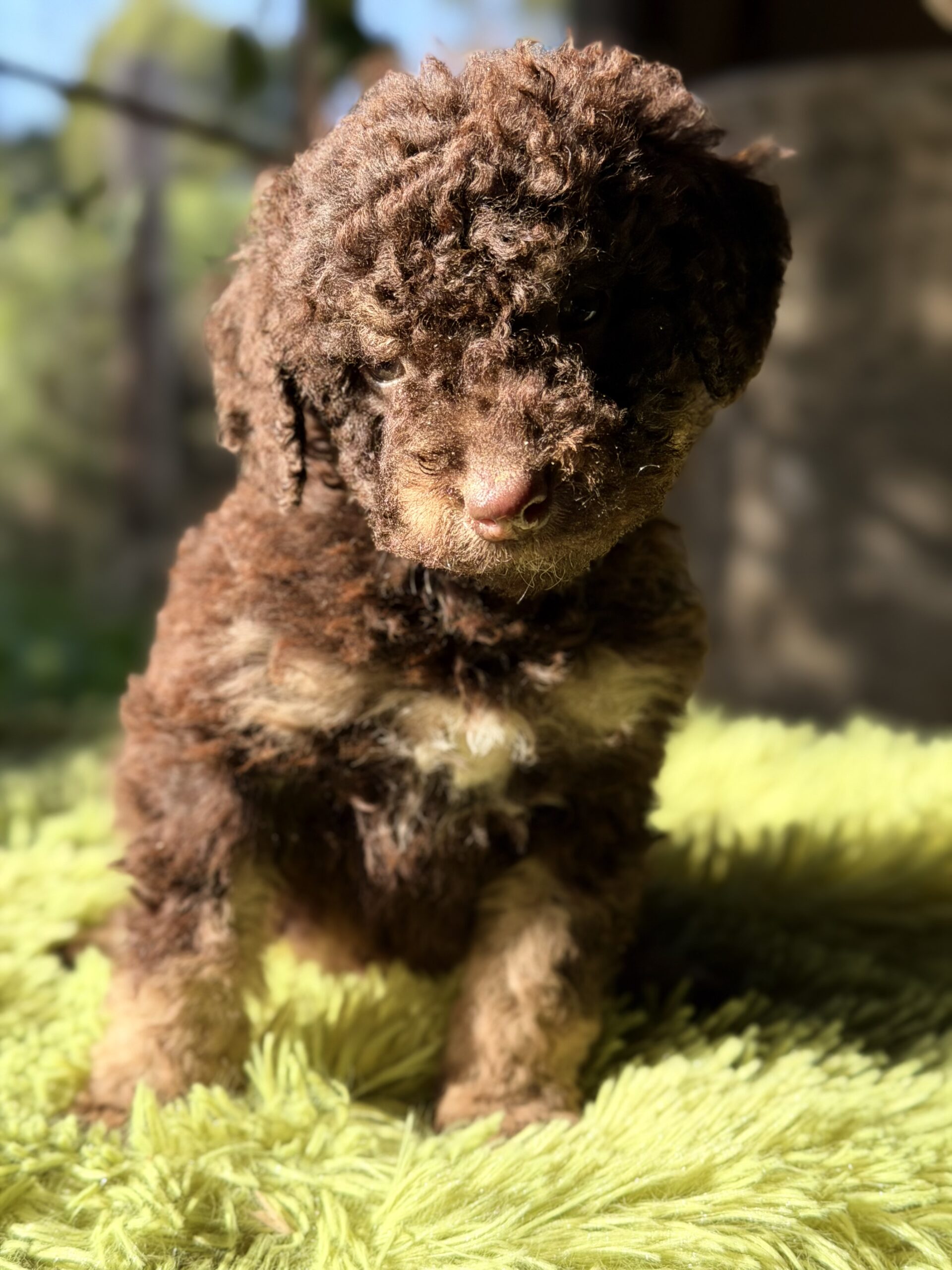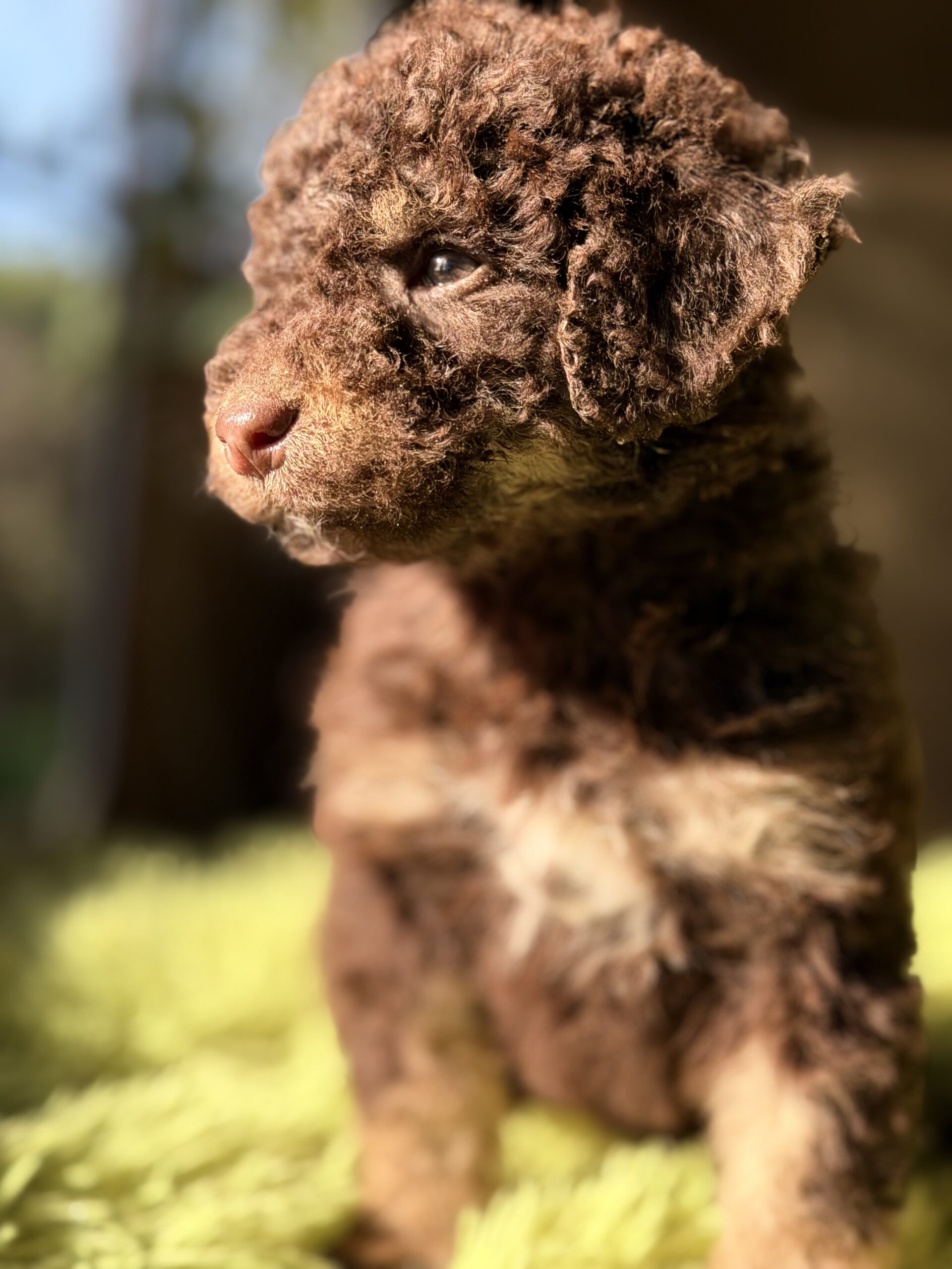 Precioso perro de Agua español chocolate & tan de ojos claros .