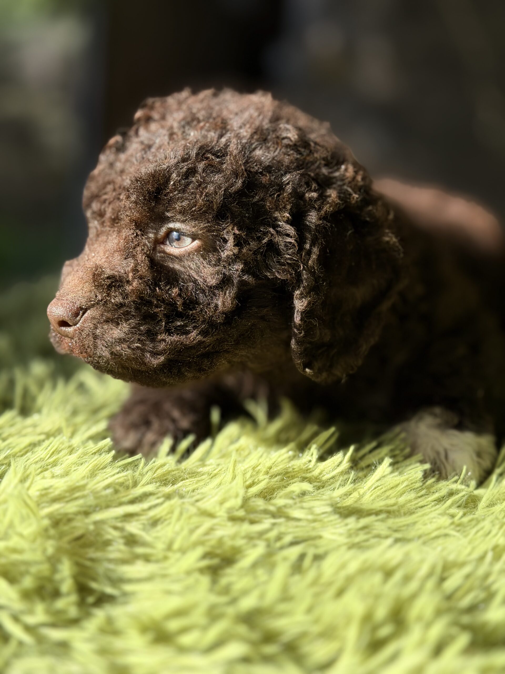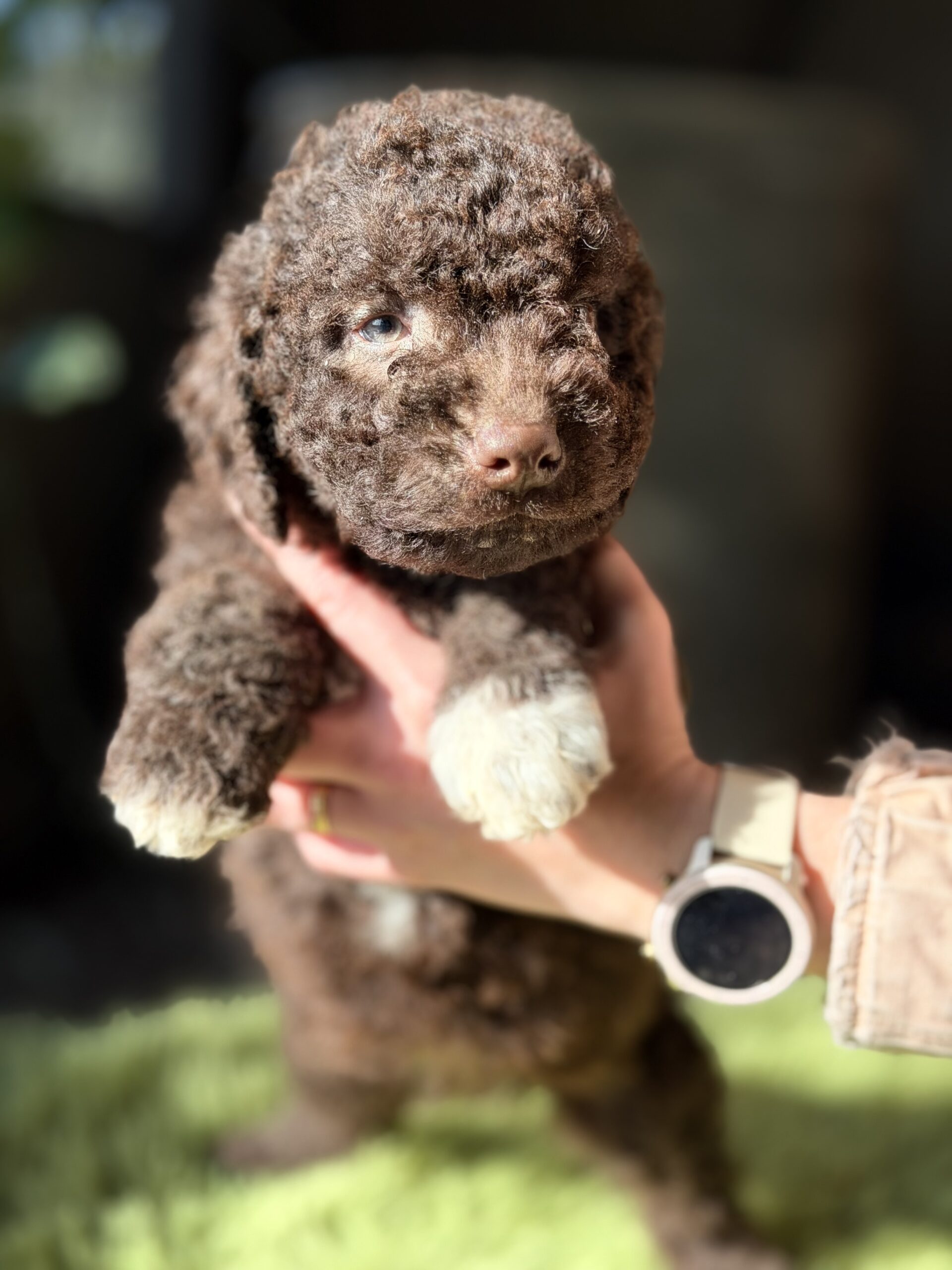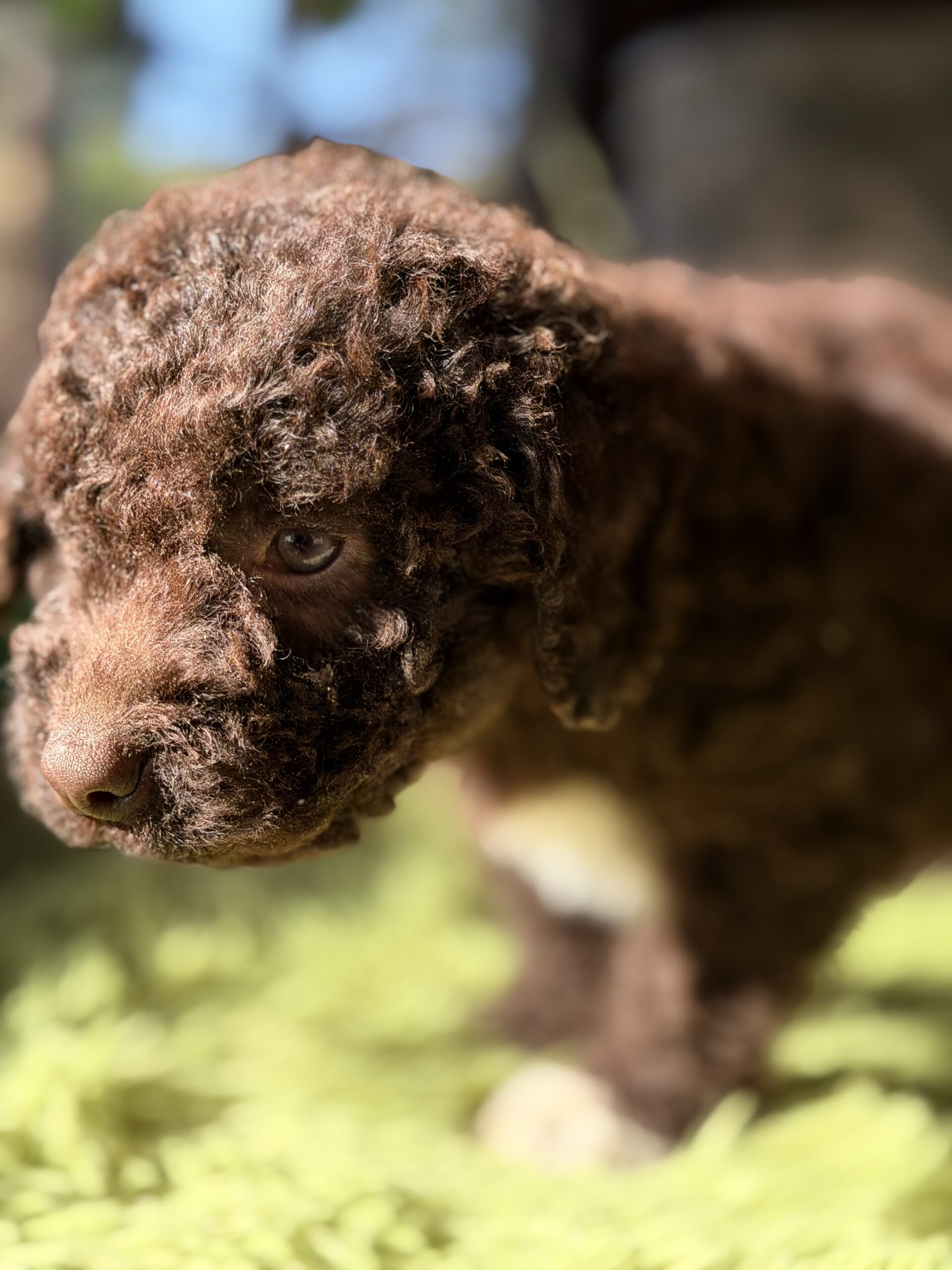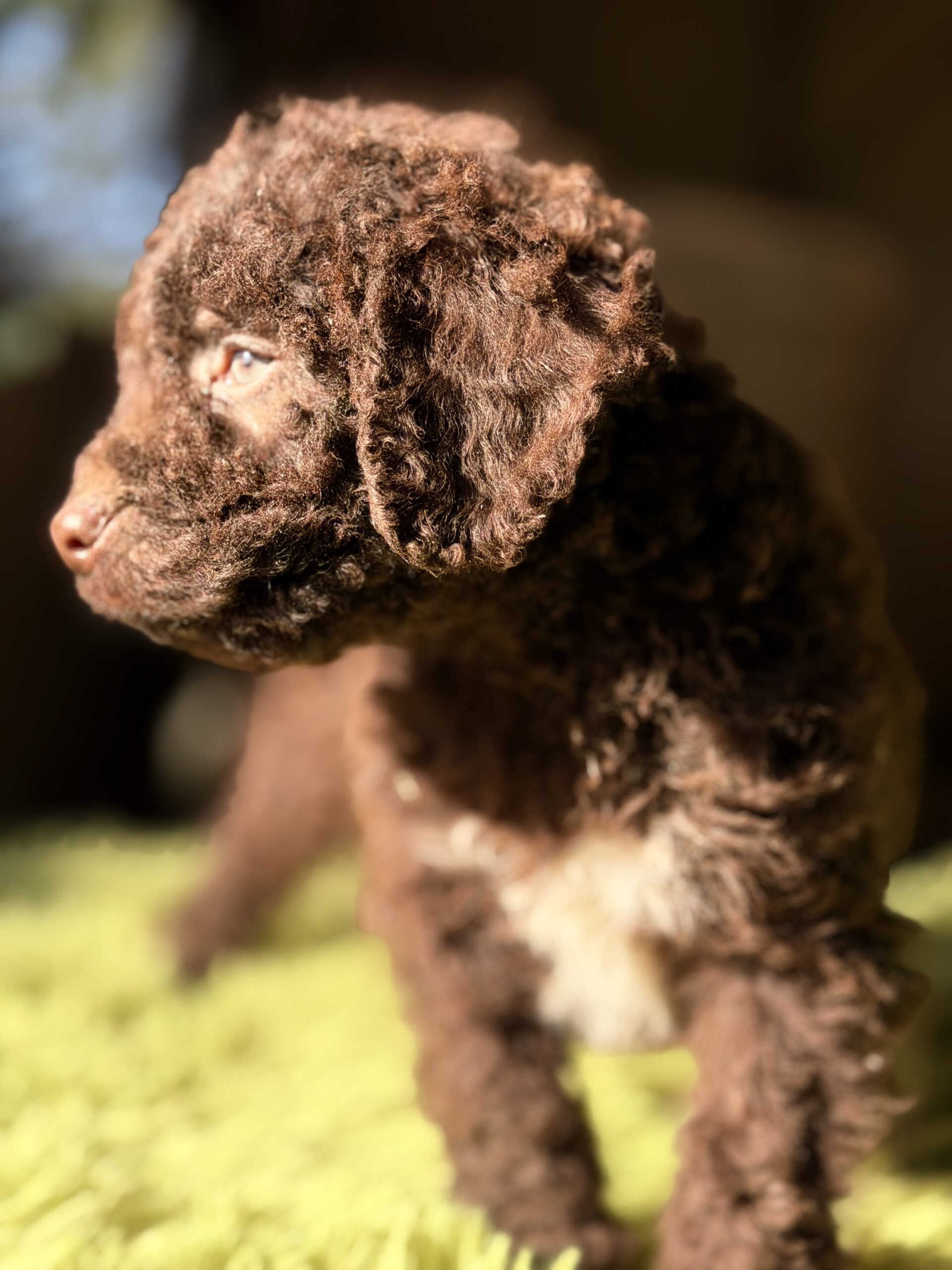 Precioso perro de Agua español chocolate y pecho blanco de ojos claros .
