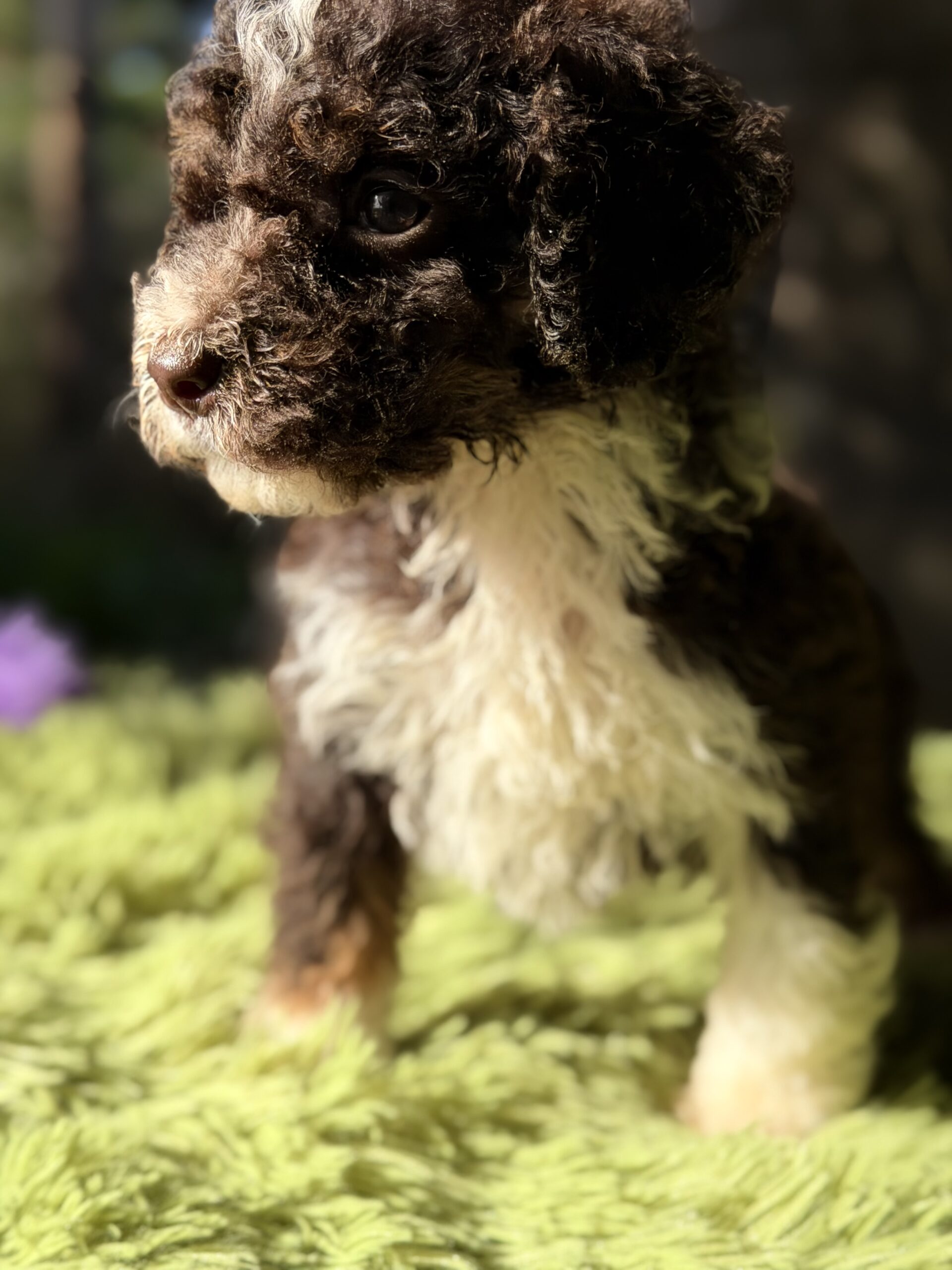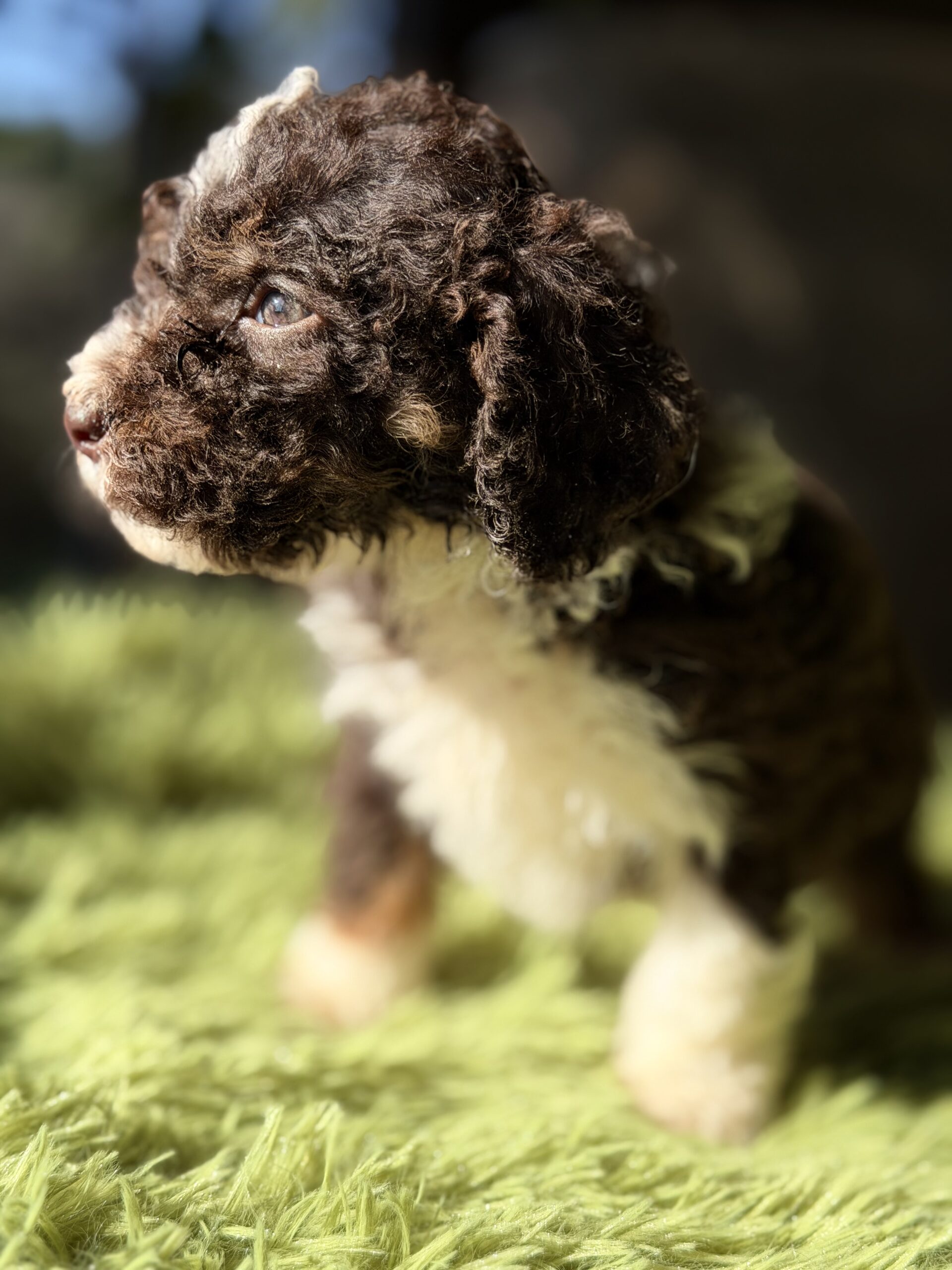 Precioso perro de Agua español chocolate y blanco de ojos claros .